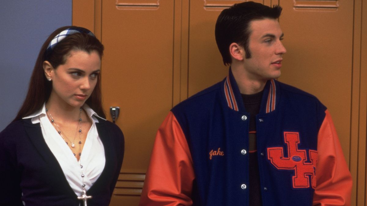 Our main character, Janey Briggs, is played by Chyler Leigh (she played Lexie on Grey's Anatomy). She is 90% Laney Boggs from She's All That (look at her name and she follows most of Laney's storyline) and 10% Kat Stratford from 10 Things I Hate About You (her father (Randy Quaid) won't let her younger brother date until she does). And I guess she's also whichever Molly Ringwald character has a best friend who's in love with her (I really need to brush up on my '80s teen comedies!) as she has a best friend named Ricky who literally tells Janey that he's in love with her every chance he gets (not to mention he reads a poem aloud in class titled "10 Things I Love About Janey", heh).It's really weird seeing Chris Evans (easily the most well-known actor in this) in this because I'm used to seeing him in a)big blockbusters or b) more serious movies and not stupid stuff like this. While there are some funny and clever elements to this movie, I gotta say the bad outweighs the good and there's a lot of cringeworthy moments in this movie. I especially felt bad for him during theVarsity Blues spoof. But this was his first movie and I guess you gotta start somewhere when you're not yet an established actor. I also felt bad for the girl playing the foreign exchange student, but we'll get to her later. Chyler Leigh also has a really embarrassing first scene (think American Pie). I suppose there'a a reason why this is the first movie (or one of the first) for many of the main actors!